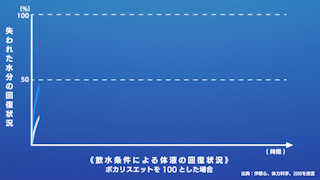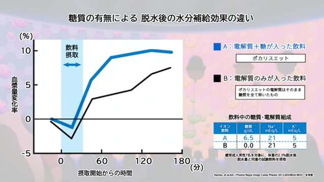 脱水後に、ナトリウムなどの電解質だけが入った飲み物よりも、電解質と糖が入っているポカリスエットを飲んだほうが、失われた体液を速やかに戻し、長く留めておけるという結果が報告されています。
